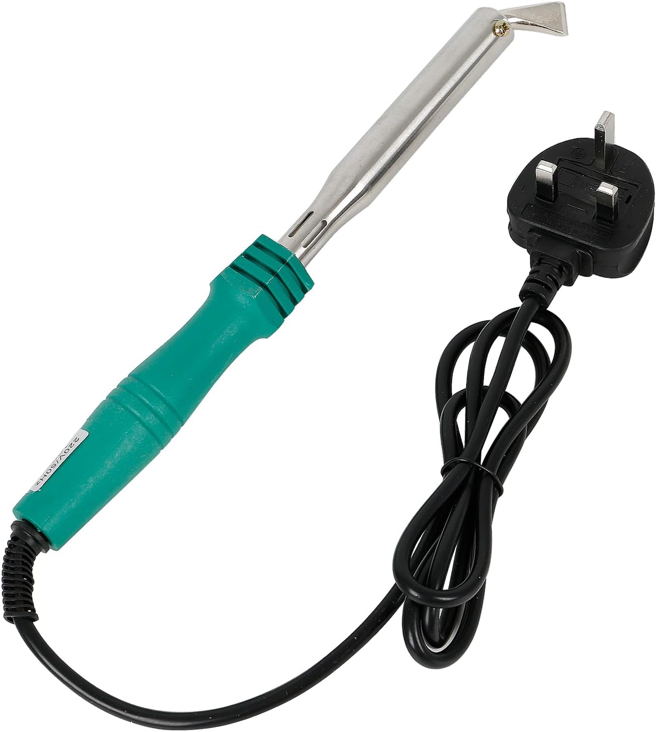 This high performance professional electric soldering iron uses a copper tip with iron-clad, pre-tinned long-life soldering top, providing stable heat transfer and extended tip life. It operates on 220V / 50Hz.