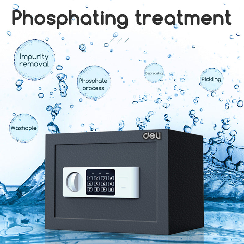 The Deli Niello Digital Safe Box T520 is a compact steel safe for use in homes offices businesses and shops. It uses an electronic password panel and an anti shock solenoid locking system with solid steel bolts and a wrinkle powder coated body. Laser cut and seamless welded construction improves resistance to drilling and prying.