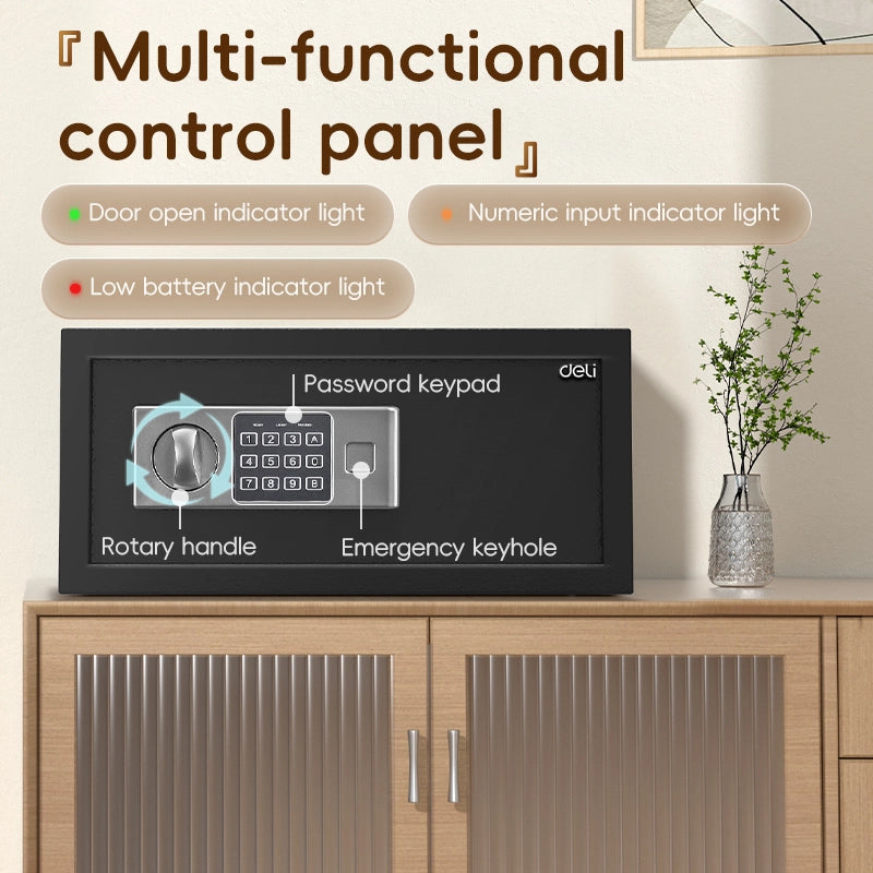 The Deli Niello Digital Safe Box T522 offers added internal space while staying compact for use in homes offices businesses and shops. It includes an electronic keypad with indicator prompts and an anti shock solenoid locking system with solid steel bolts. The steel body is wrinkle powder coated. Laser cut and seamless welded construction improves resistance to prying and drilling.