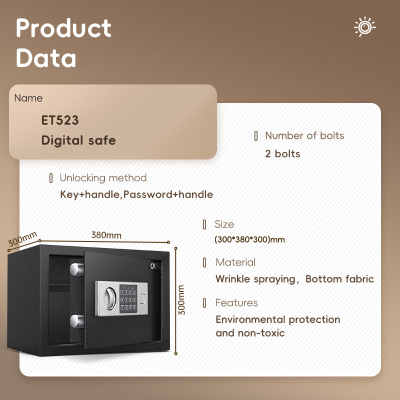 The Deli Niello Digital Safe Box T523 balances capacity and footprint and includes a removable interior shelf for use in homes offices businesses and shops. It uses an electronic keypad with indicator prompts and an anti shock solenoid locking system with solid steel bolts. The steel body is wrinkle powder coated. Laser cut and seamless welded construction improves resistance to drilling and prying.