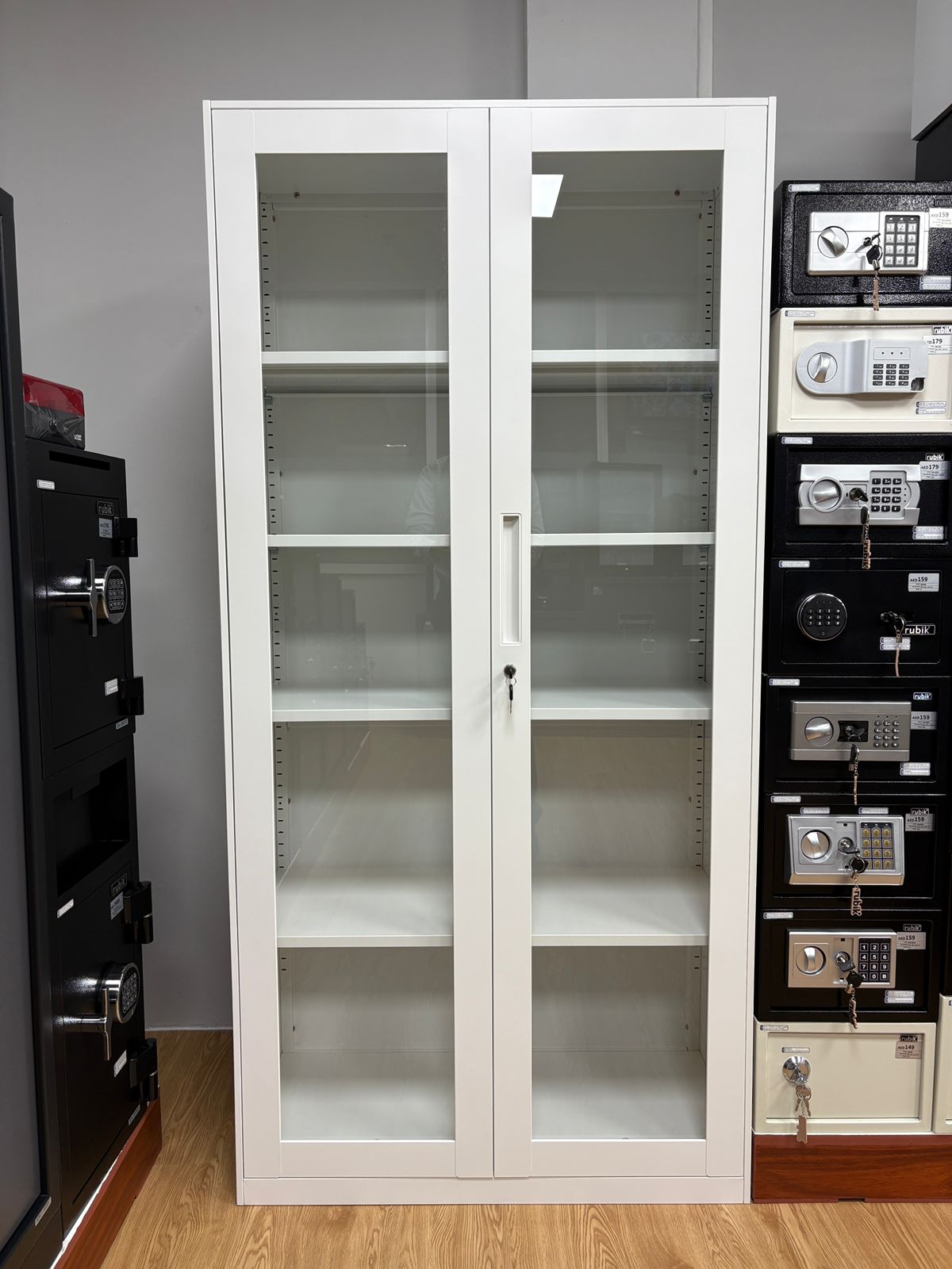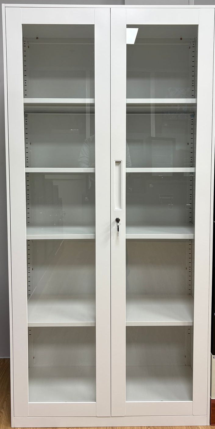 This 1.85 meter tall cabinet is made of cold-rolled steel and fitted with tempered glass swing doors. It is designed for storing office files, folders, documents, and supplies in an organized manner. The structure includes four adjustable shelves gives 5 compartments that can be repositioned according to storage needs.