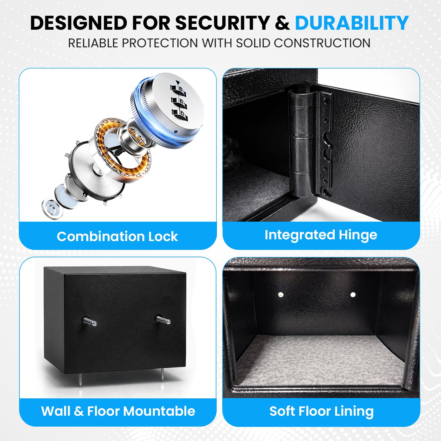 • Flexible Mounting Options: Pre-drilled holes for secure wall or floor mounting with included hardware, or use as a portable safe box to suit your security needs