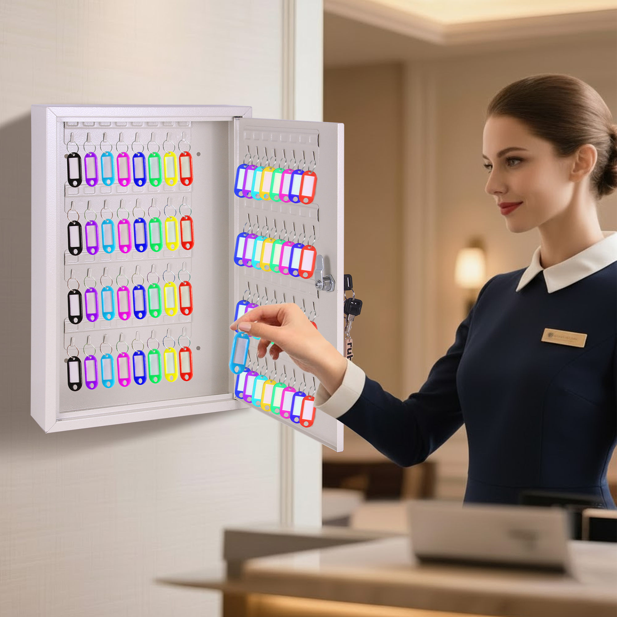 This professional 64 keys capacity full-metal Rubik key storage lock box (safe box) provides secure and organized storage for multiple keys with mechanical key lock. Designed for commercial use, wall mounted, it features a simple key lock mechanism and a durable powder-coated steel body with smooth, rounded corners for safety and appearance.