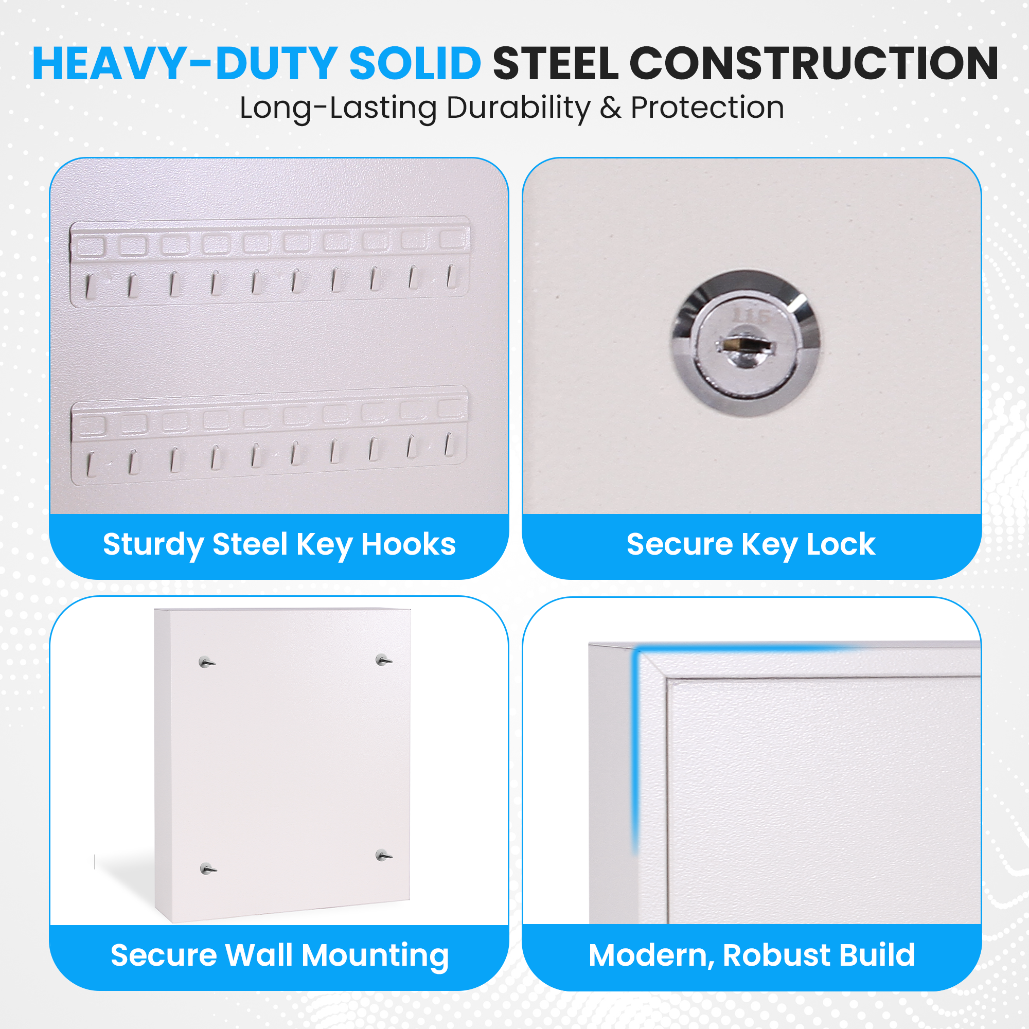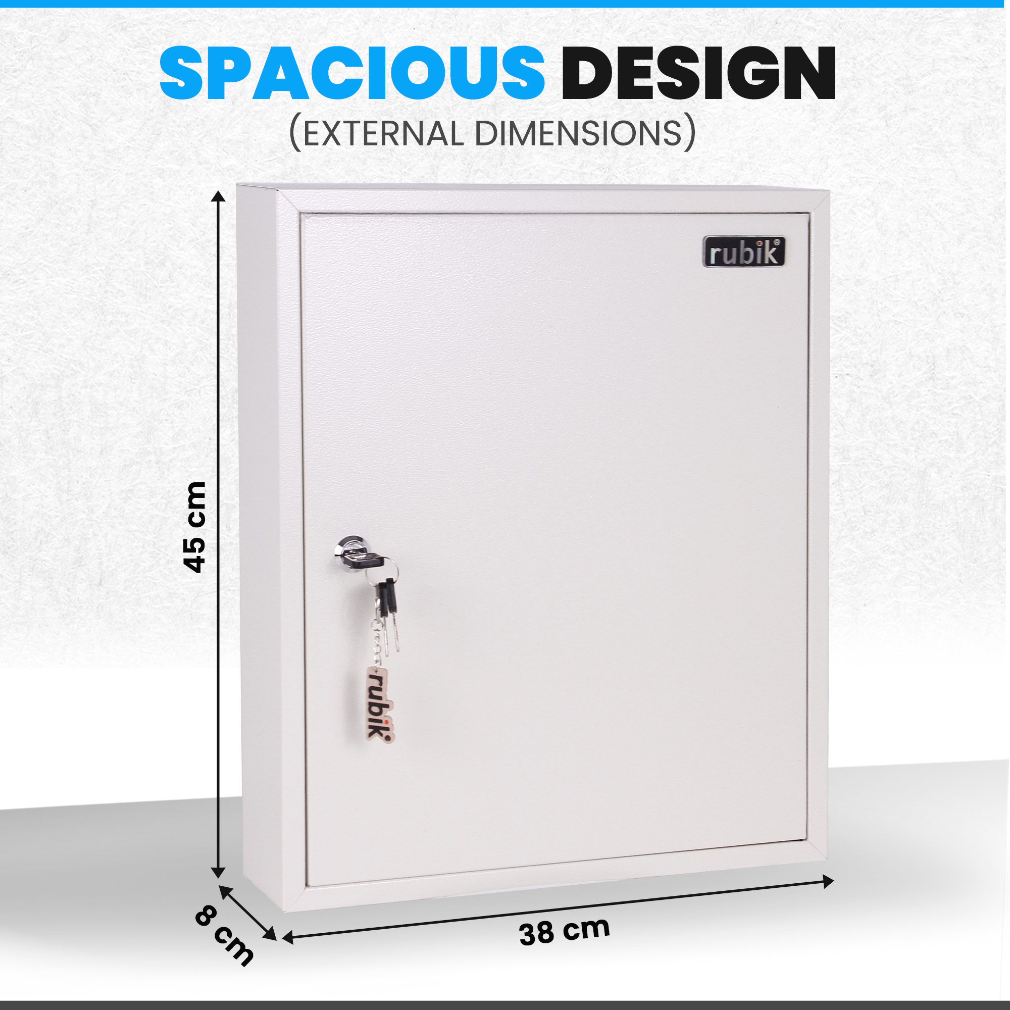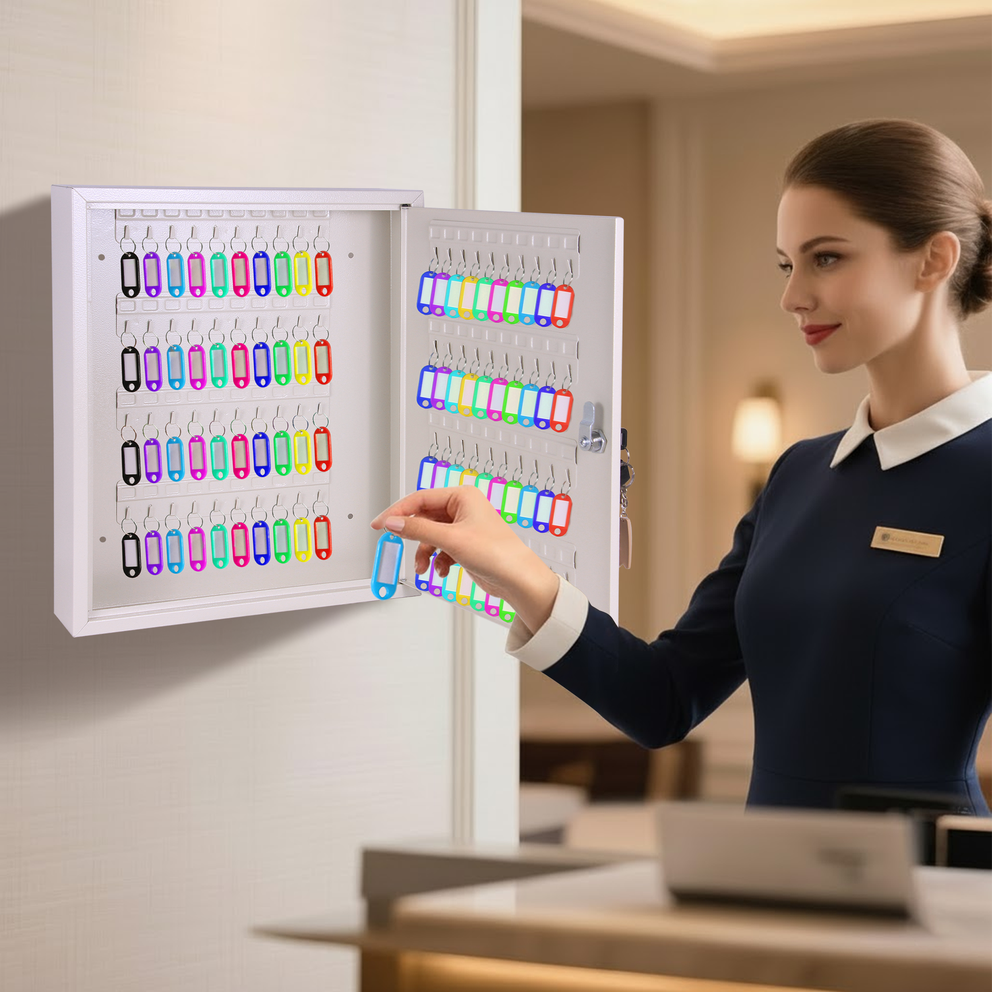 This professional 64 keys capacity full-metal Rubik key storage lock box (safe box) provides secure and organized storage for multiple keys with mechanical key lock. Designed for commercial use, wall mounted, it features a simple key lock mechanism and a durable powder-coated steel body with smooth, rounded corners for safety and appearance.