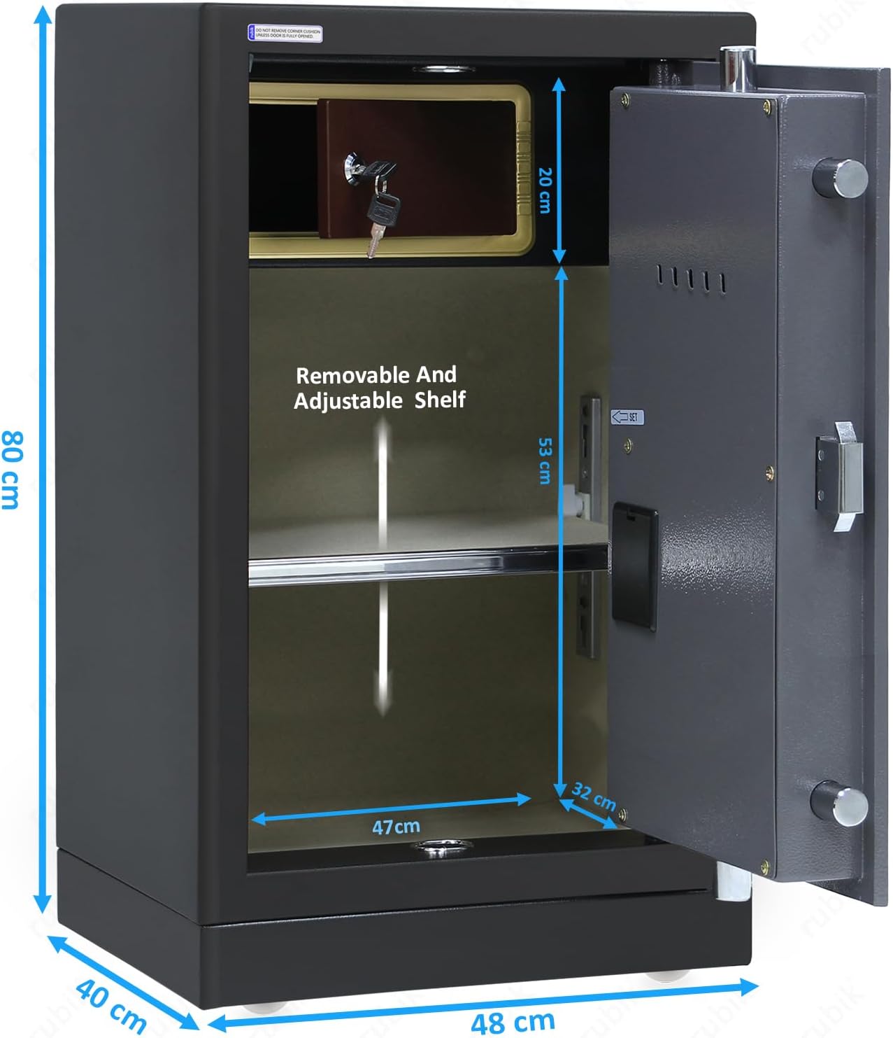 RBGX-73XTD measures 80x48x40cm and weighs 48kg. It includes one adjustable shelf and a lockable inner compartment. The safe uses dual locking with a digital PIN code and a key, supported by heavy duty locking bolts and concealed hinges.
