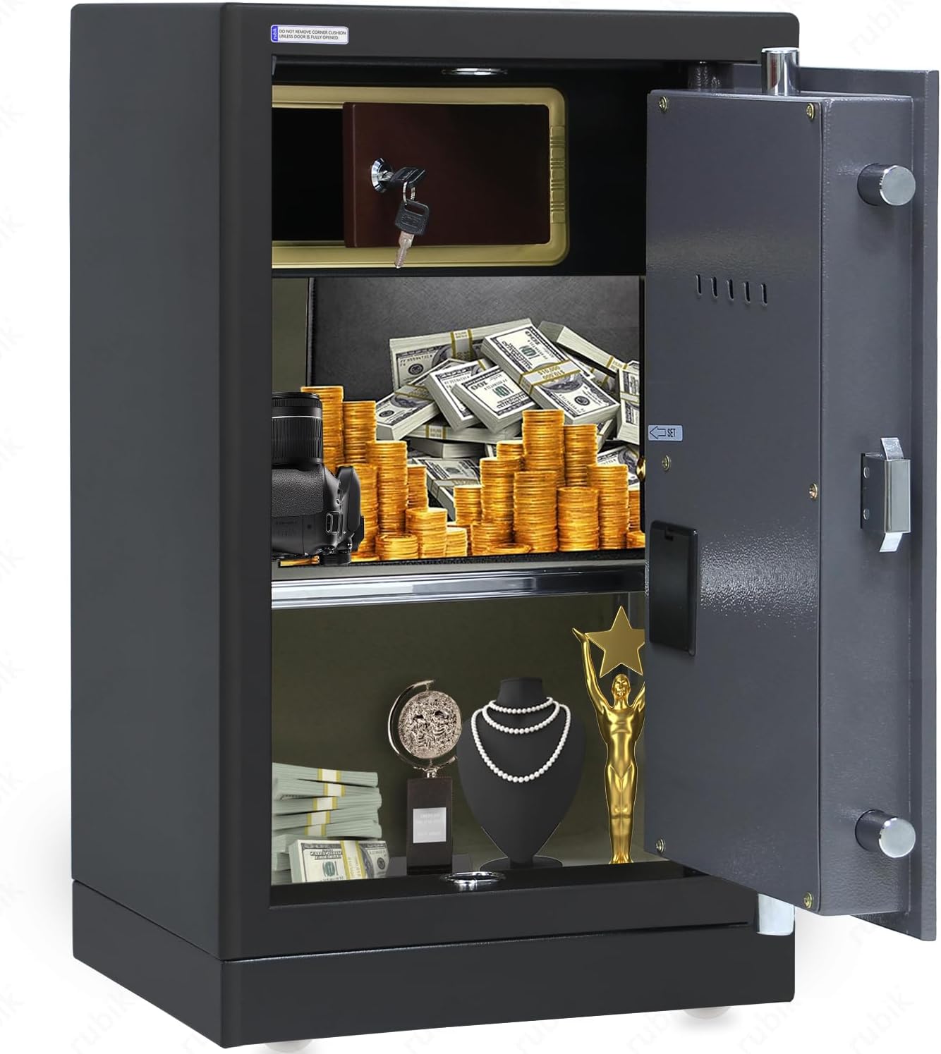 Inside, each safe has a soft lined interior to protect items from scratches and impact. A small lockable compartment is provided for minor valuables, along with an adjustable or removable shelf depending on model size. The internal layout supports organized storage for documents, cash, electronics, and other personal items.
