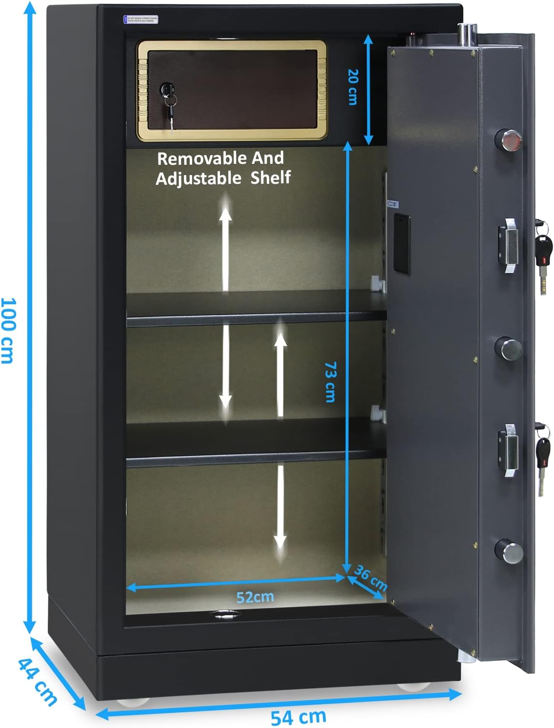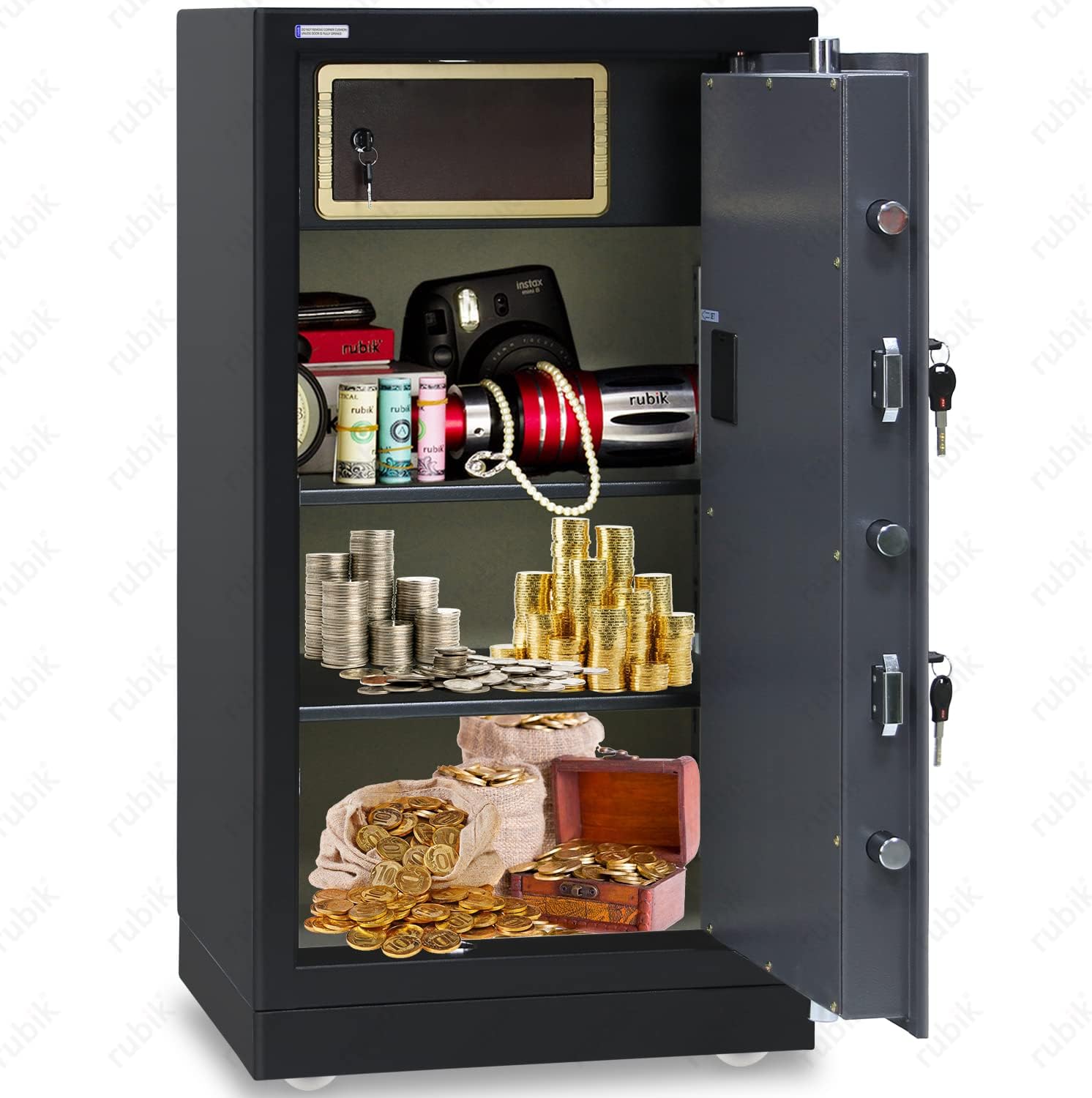 RBGX-100XTD measures 100x54x44cm and weighs 85kg. It includes one adjustable shelf and a lockable inner compartment. The safe uses dual locking with a digital PIN code and a key, supported by heavy duty locking bolts and concealed hinges.