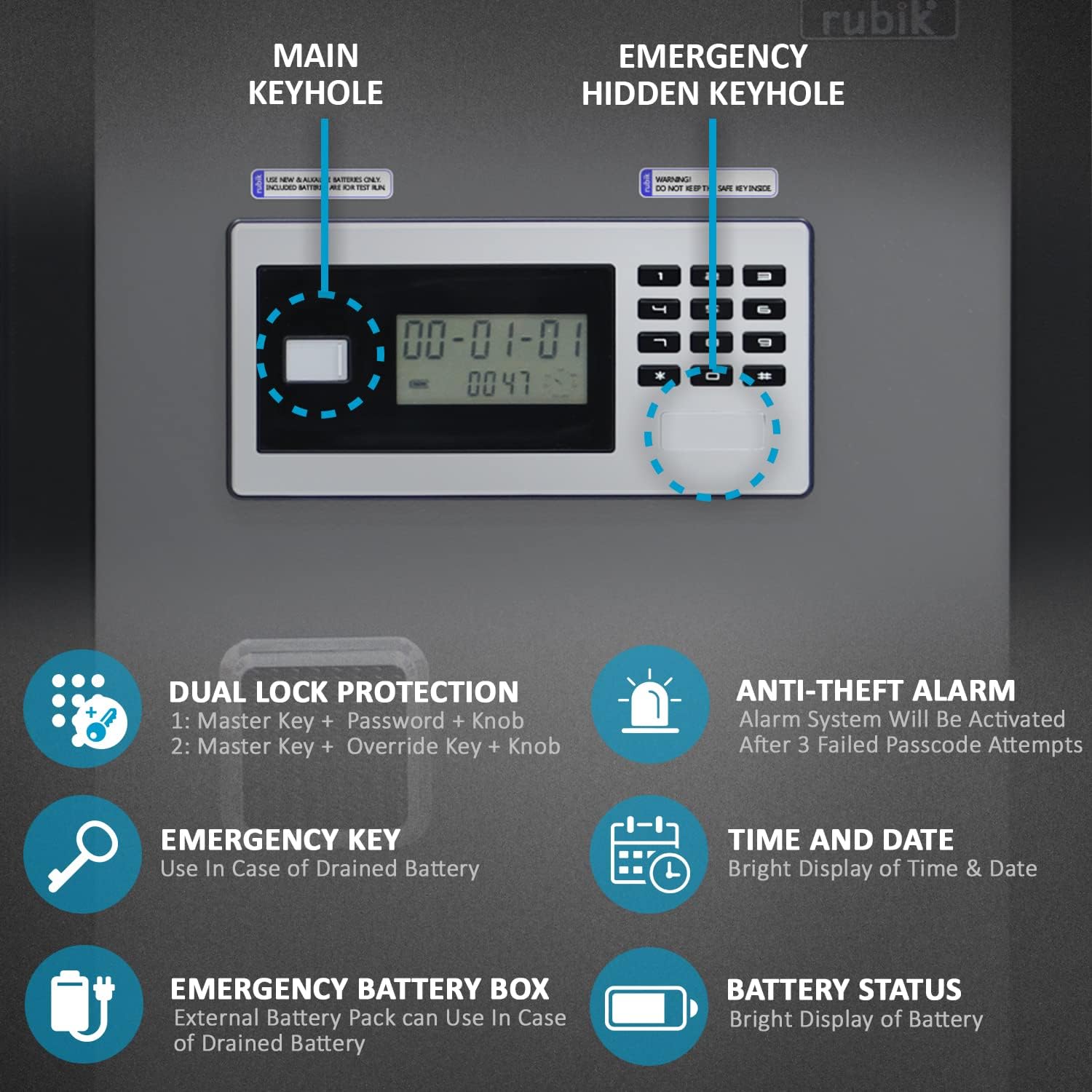 The Rubik XTD Series is a premium range of digital safe boxes manufactured with a reinforced steel body and solid steel door. The construction is designed for secure storage of valuables in homes, offices, and executive spaces. All models include steel locking latch bolts and concealed hinges to reduce pry points. The exterior has a durable powder coated two tone finish.