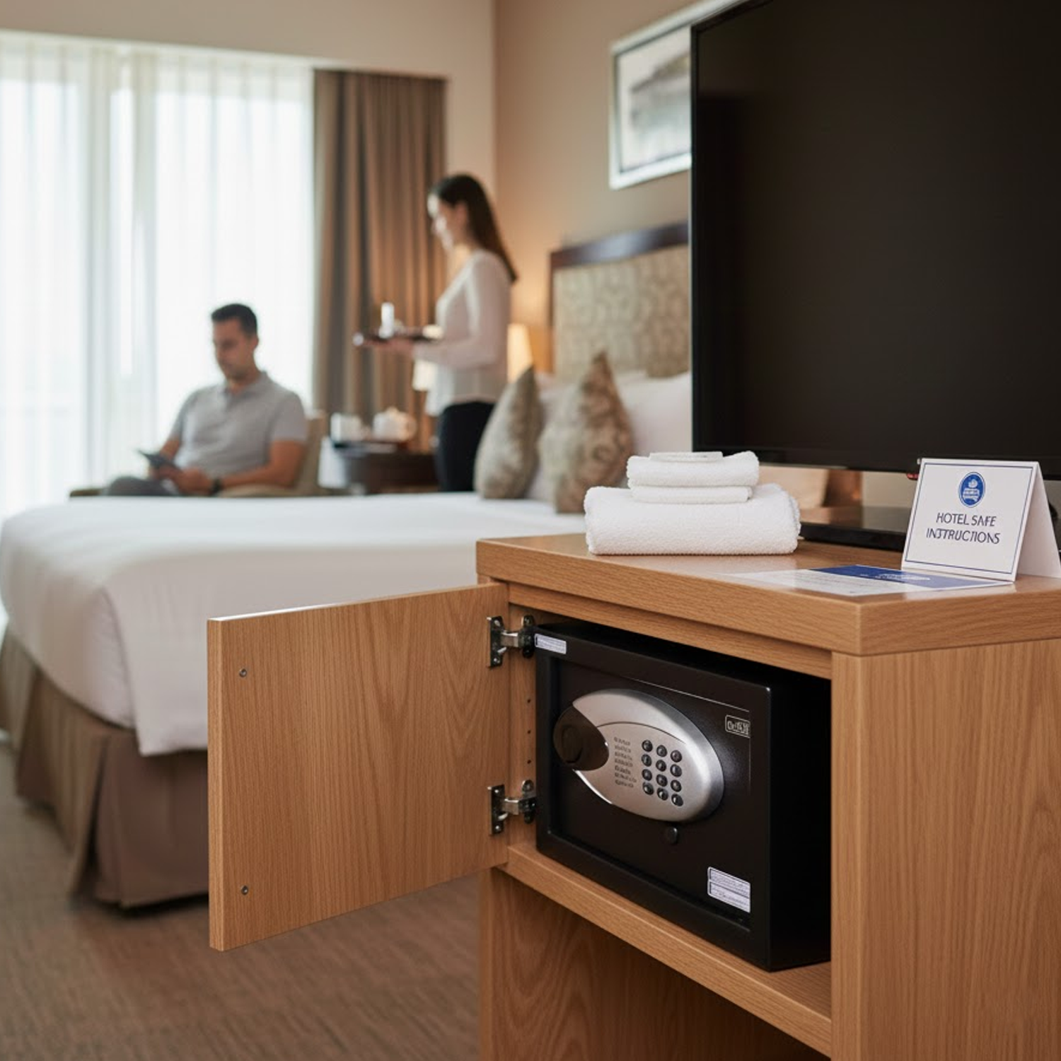 It is guest ready for room safety, it has digital lock and display, it provides convenient access via Guest Code, Master Code, or Key. Its automatic motorized lock ensures  locking and unlocking. Size is convenient and and guest can store items such as small valuables cash, passport, camera, and jewelry. Made from solid steel with  concealed hinges and two strong locking bolts.