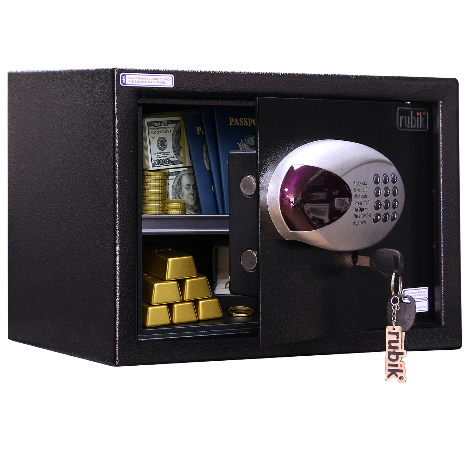 7. Emergency Ready: Equipped with manual Key Lock, comes with common emergency override keys, the Rubik safe ensures access using these keys even if you forget your pin codes or if batteries deplete.