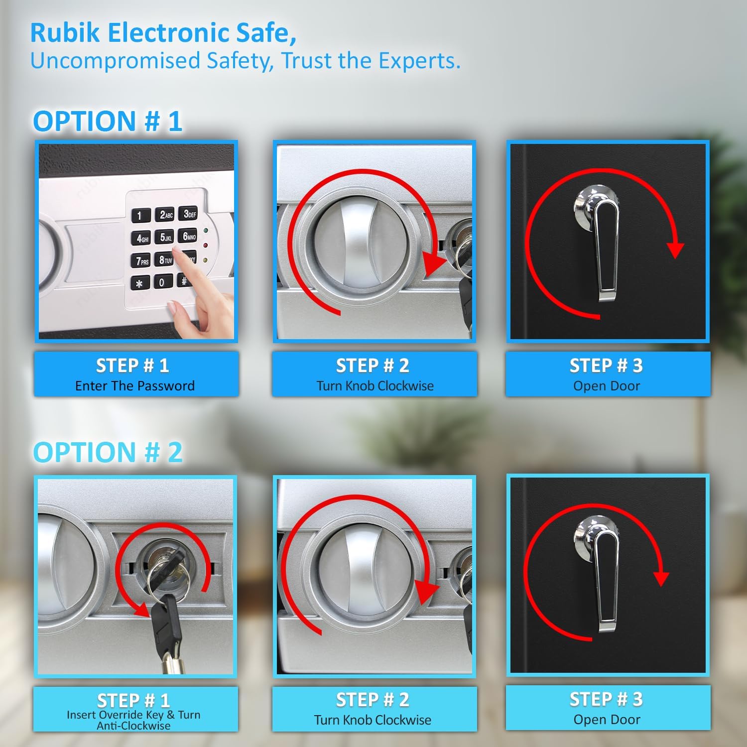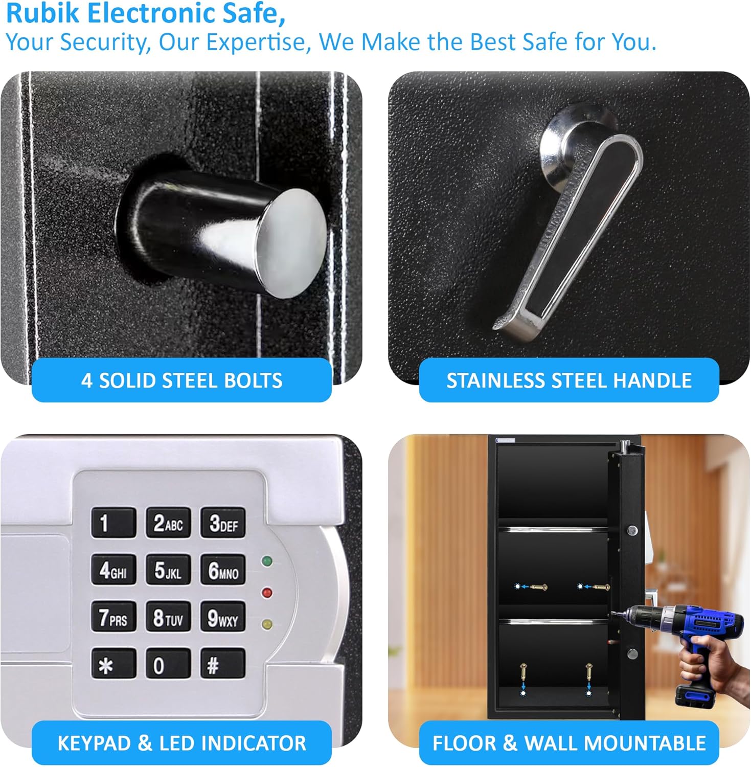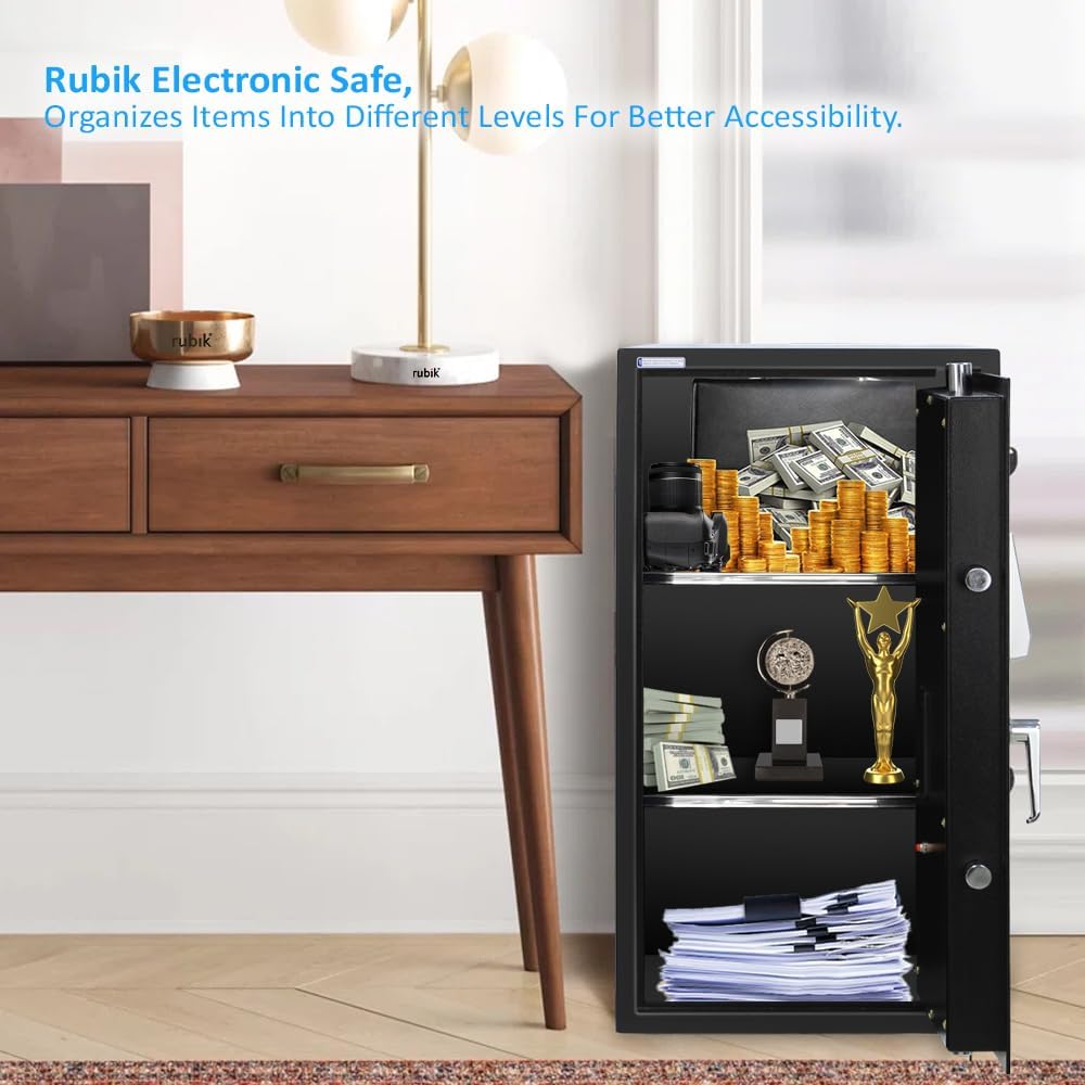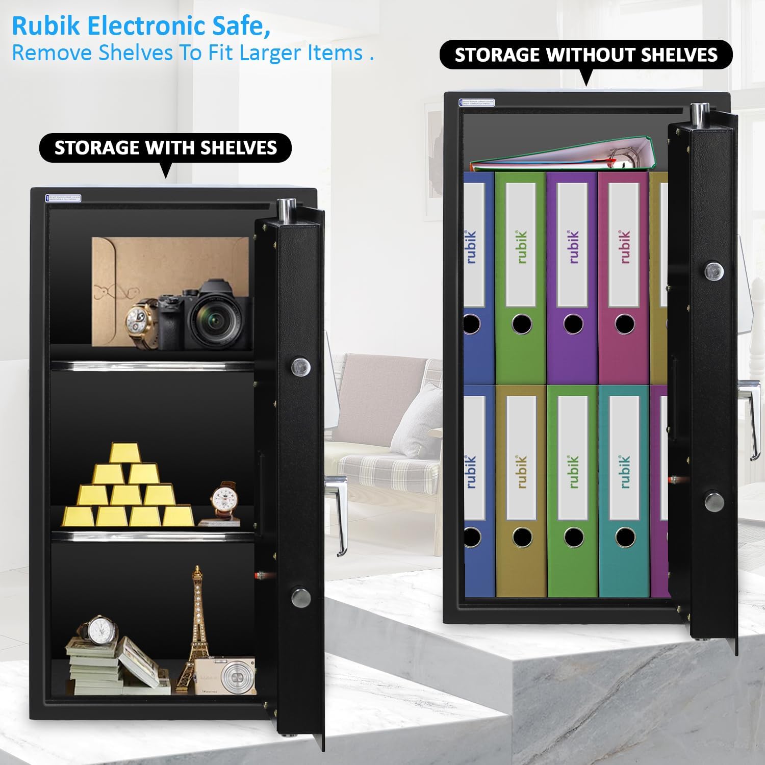 This large sized Rubik Safety Box features an electronic digital lock with emergency override keys, re-programmable access code, and a 4.23 cubic feet body. Built with solid steel construction, 4 locking bolts, and concealed hinges, this safety box is designed for secure and practical storage. The tall internal space with 2 removable shelves supports organized storage for documents and valuables, with enough clearance for larger items when shelves are removed. The unit includes a stainless steel handle for controlled opening and handling.