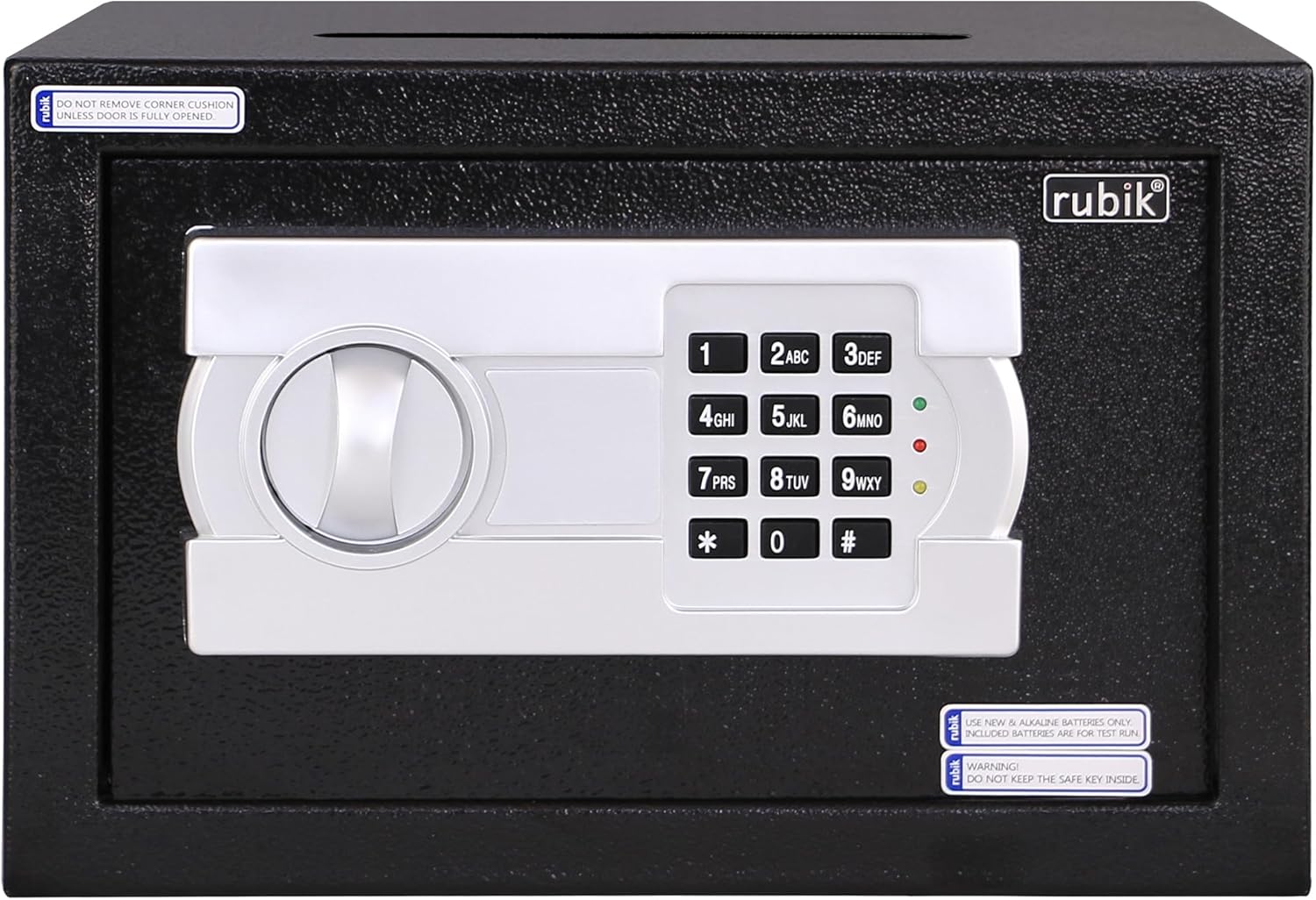 The Rubik RB20EG-T Drop Slot Safety Box features a convenient top deposit (drop-in) slot, allowing users to deposit documents or cash bills securely without opening the safe (also known as a depository safe). Designed for compact spaces, this model is equipped with an electronic digital lock, emergency override keys, and a 0.43 cubic feet (approx. 12.2 liters) internal capacity.