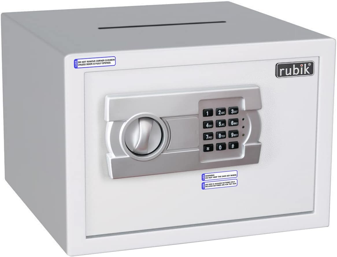 The Rubik RB25EG-T drop slot safety box features a convenient 'drop-in' cutout window for effortlessly depositing documents or cash money bills without the need for unlocking (also known as depository-safes). This safety box is equipped with an electronic digital lock, accompanied by emergency override keys, a re-programmable access code, and a compact 0.77 cubic feet body. Solid steel construction, live-door locking bolts, and concealed hinges, this safety box is both simple and robust, renowned for its durability and reliability.