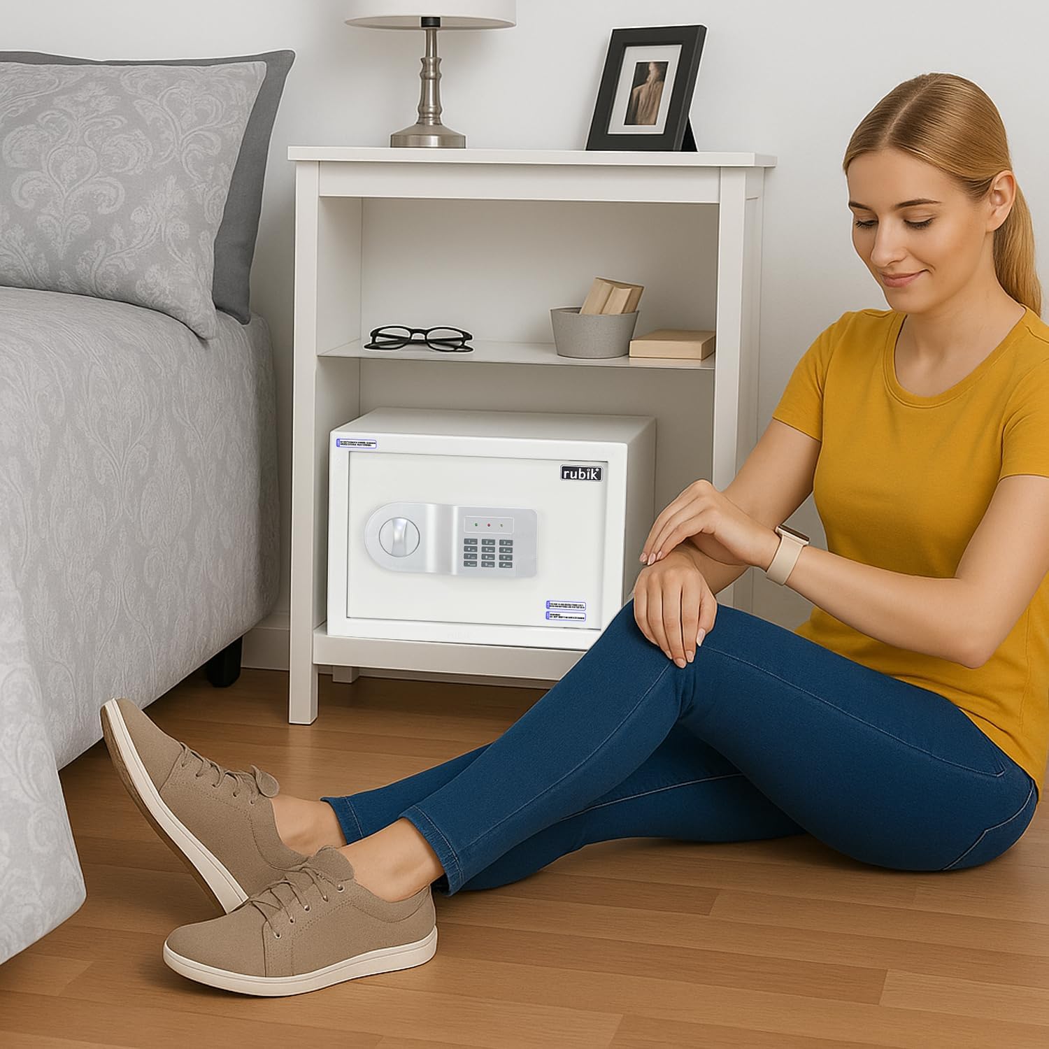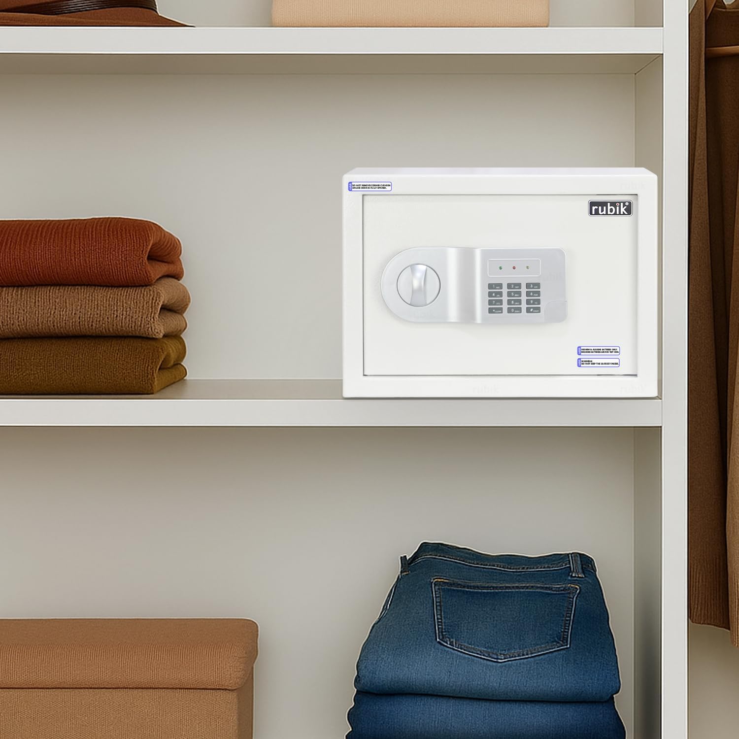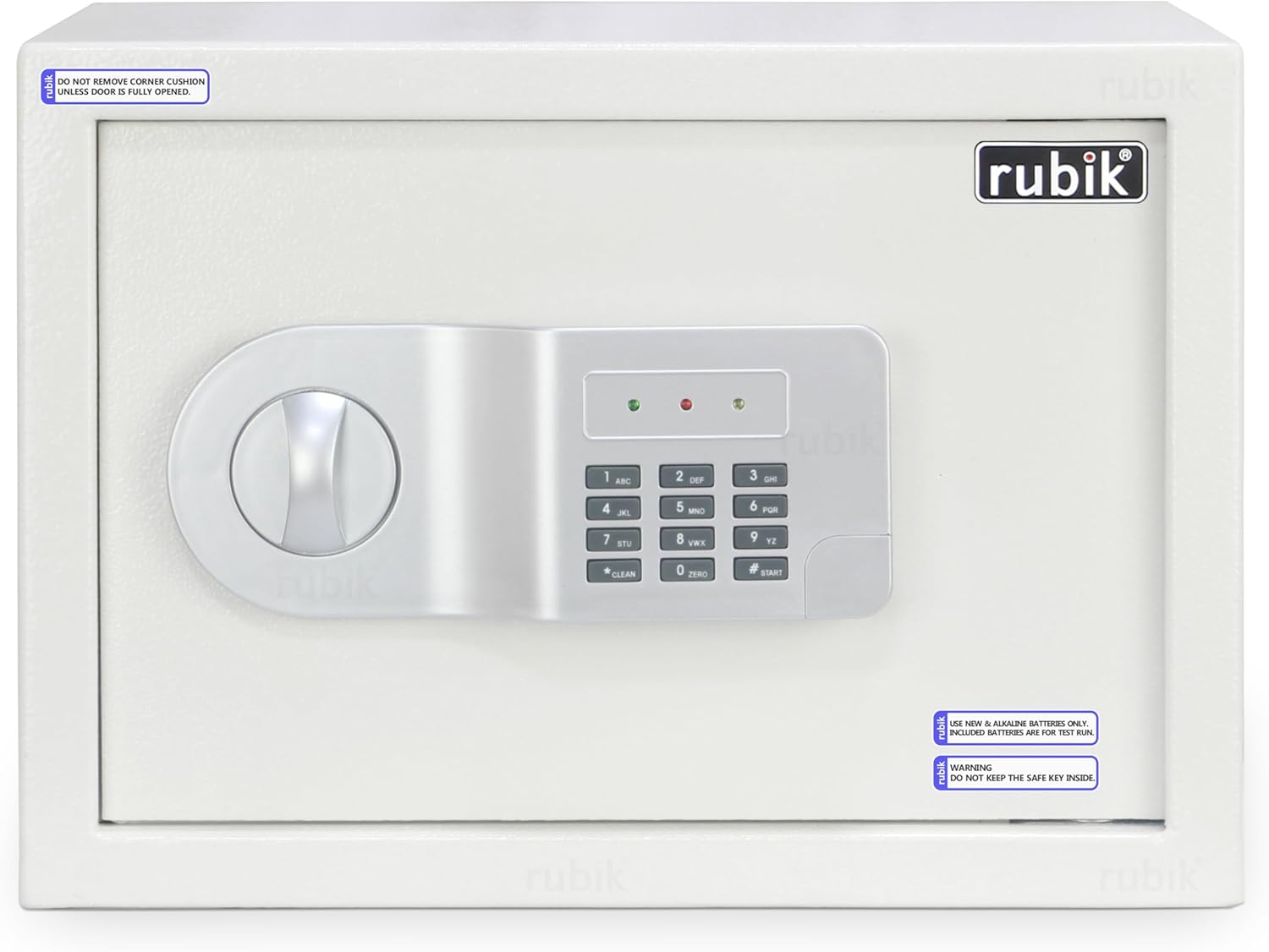 This medium sized Rubik Safety Box features electronic digital lock with emergency override keys, re-programmable access code, and a compact 0.77cubic feet body. Built with solid steel construction, live-door locking bolts, and concealed hinges, this safety box is simple and robust and known for durability and reliability.