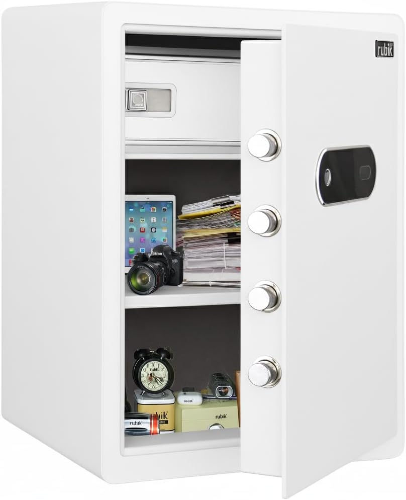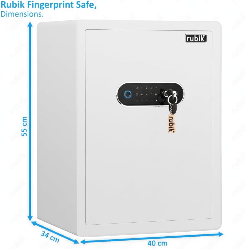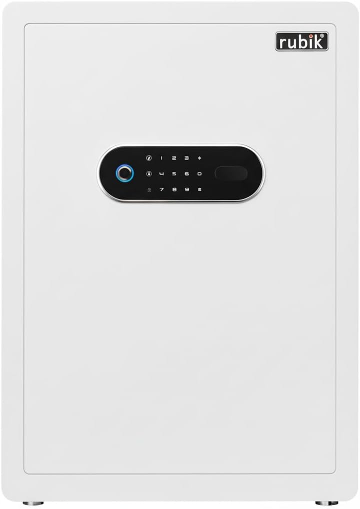 Rubik RB-AM55 Biometric Fingerprint Safe Box. Built for home and office security, this motorized auto lock safe offers fast access through fingerprint recognition, PIN code, or a combination of both. Its sleek white finish and premium soft lined interior make it a secure and elegant storage solution for documents, jewelry, cash, and electronics.
