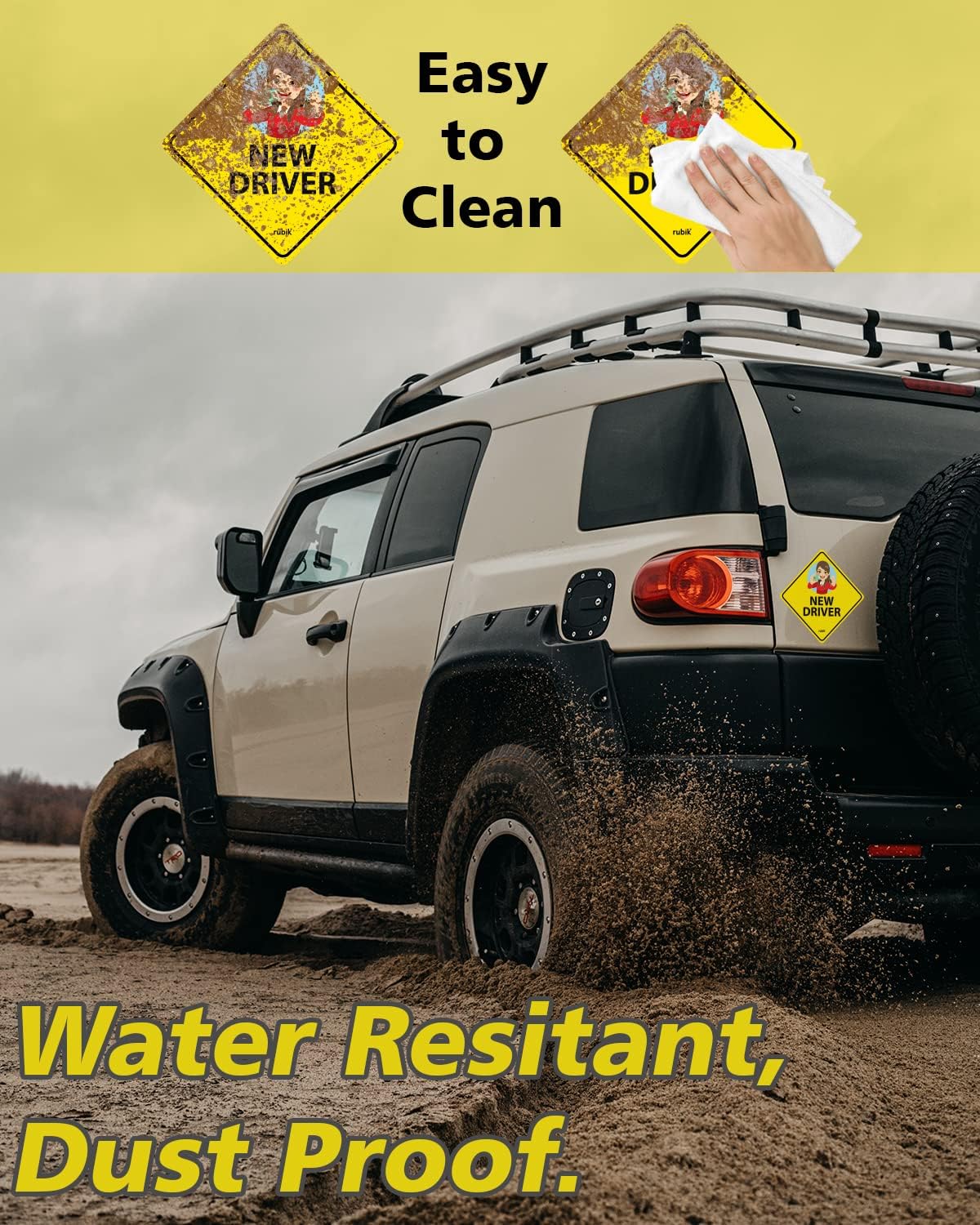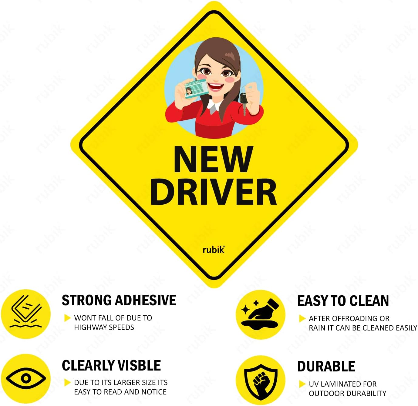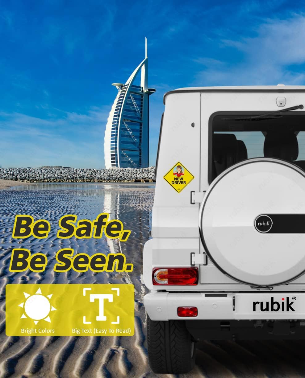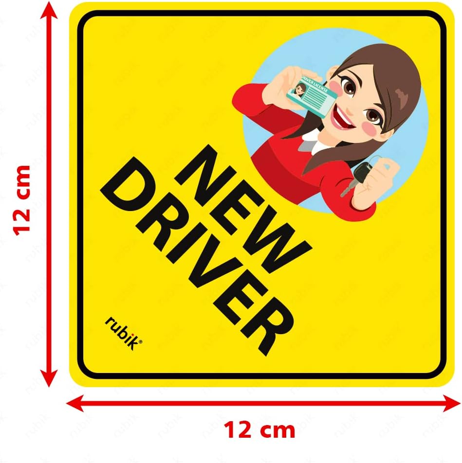 This reflective new driver car sign is a self-adhesive sticker designed to alert other drivers that a beginner is behind the wheel. The self-adhesive decal sticks securely to car body, glass, or plastic bumpers and remains intact through car washes without needing removal.