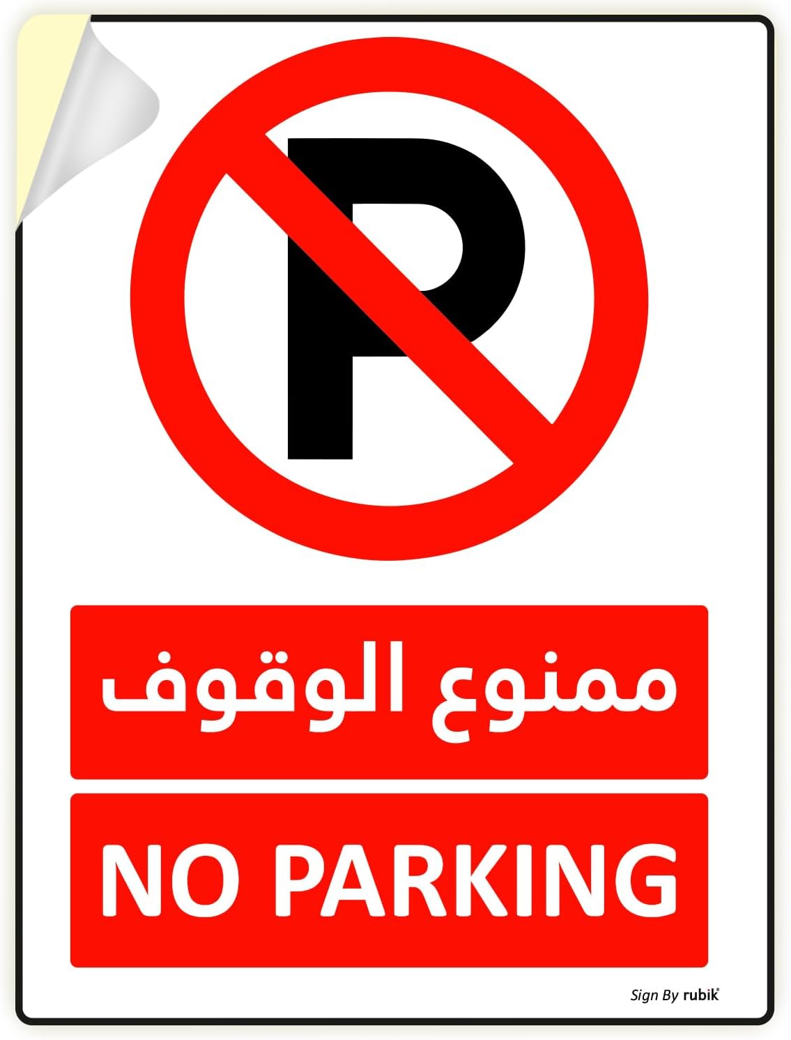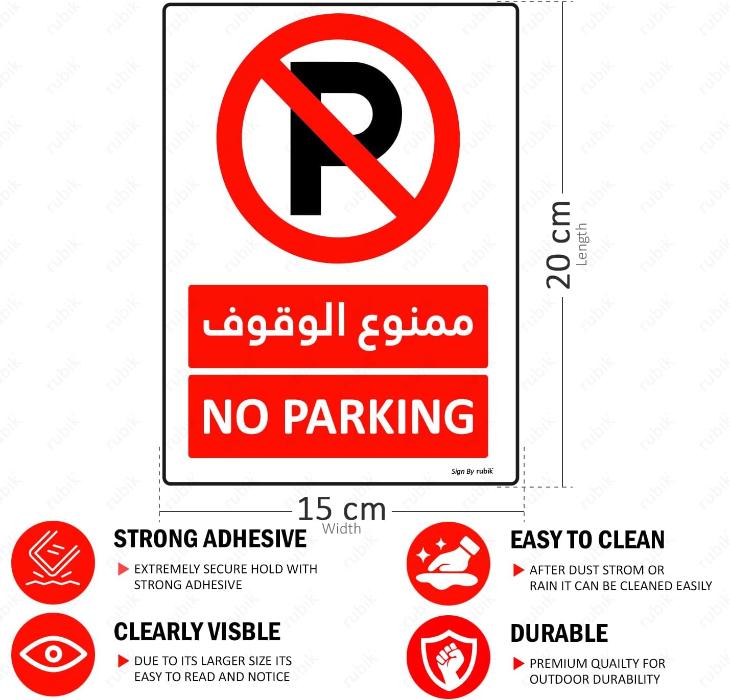 Premium quality self-adhesive no parking sign sticker featuring bilingual Arabic and English text in high-visibility red and white design. Made from durable waterproof vinyl with highly reflective coating for maximum visibility day and night. Strong adhesive backing ensures secure attachment to multiple surfaces.