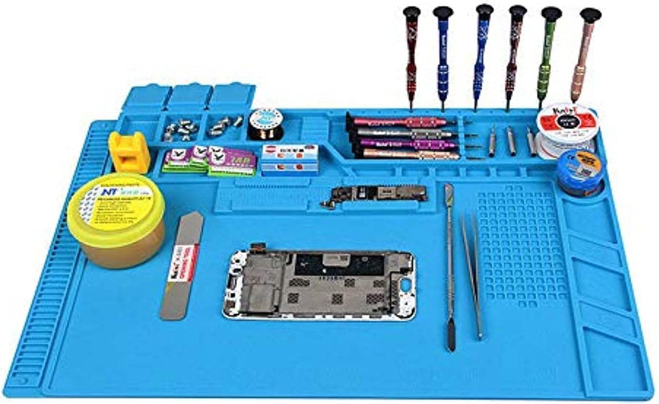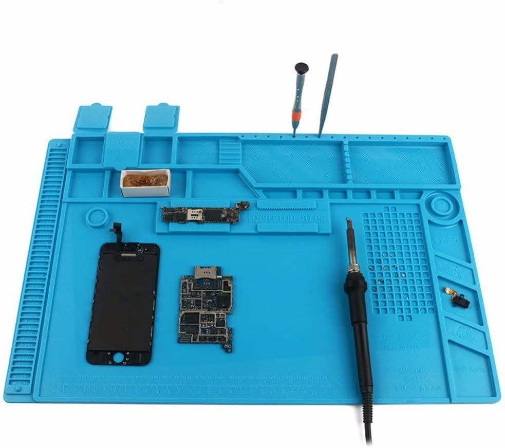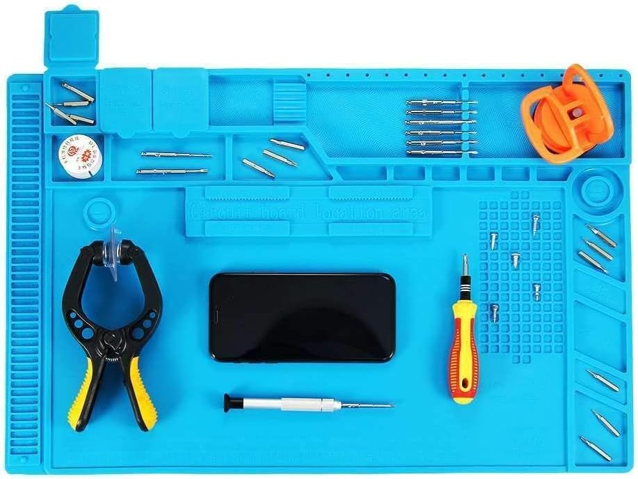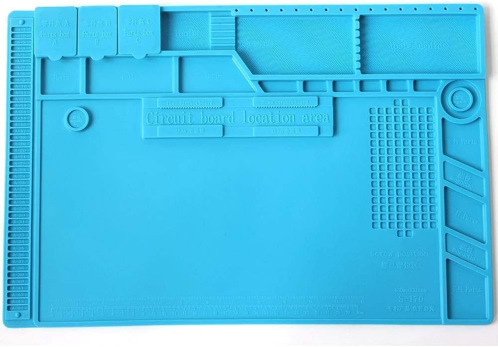 The S-170 Silicone repair mat is a professional-grade work station designed for electronics repair, soldering, and circuit board assembly. Built from high-quality silicone, it features 124 labeled screw position slots, 3 parts boxes with lids, and 18 notches to keep components organized during disassembly. The mat offers excellent heat insulation, allowing direct soldering on its surface, and resists corrosion and deformation over time.