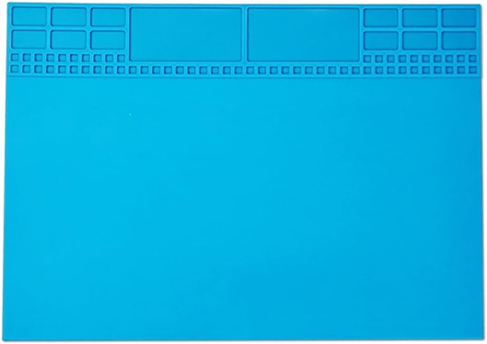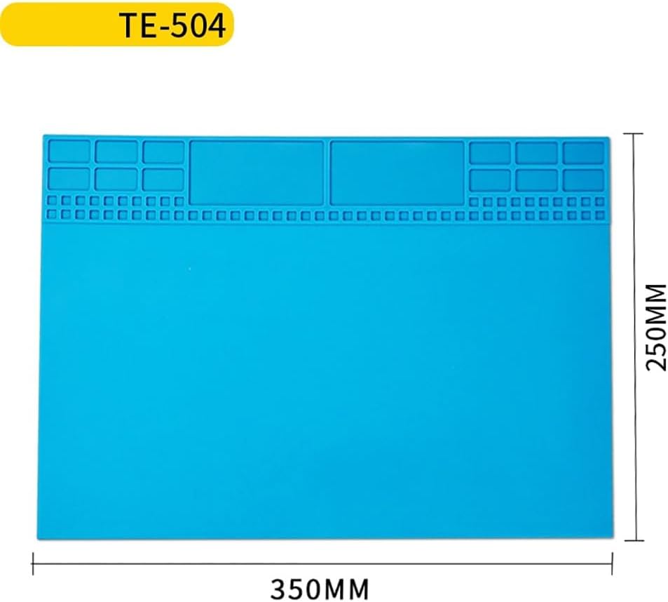 The TE-504 Soldering Mat is a 35x25cm premium silicone work station pad designed for electronics repair professionals and hobbyists. Made from anti-static, non-toxic, non-slip silicone, it provides a safe, heat-resistant, and organized surface for BGA soldering, phone repair, laptop servicing, and circuit board work.