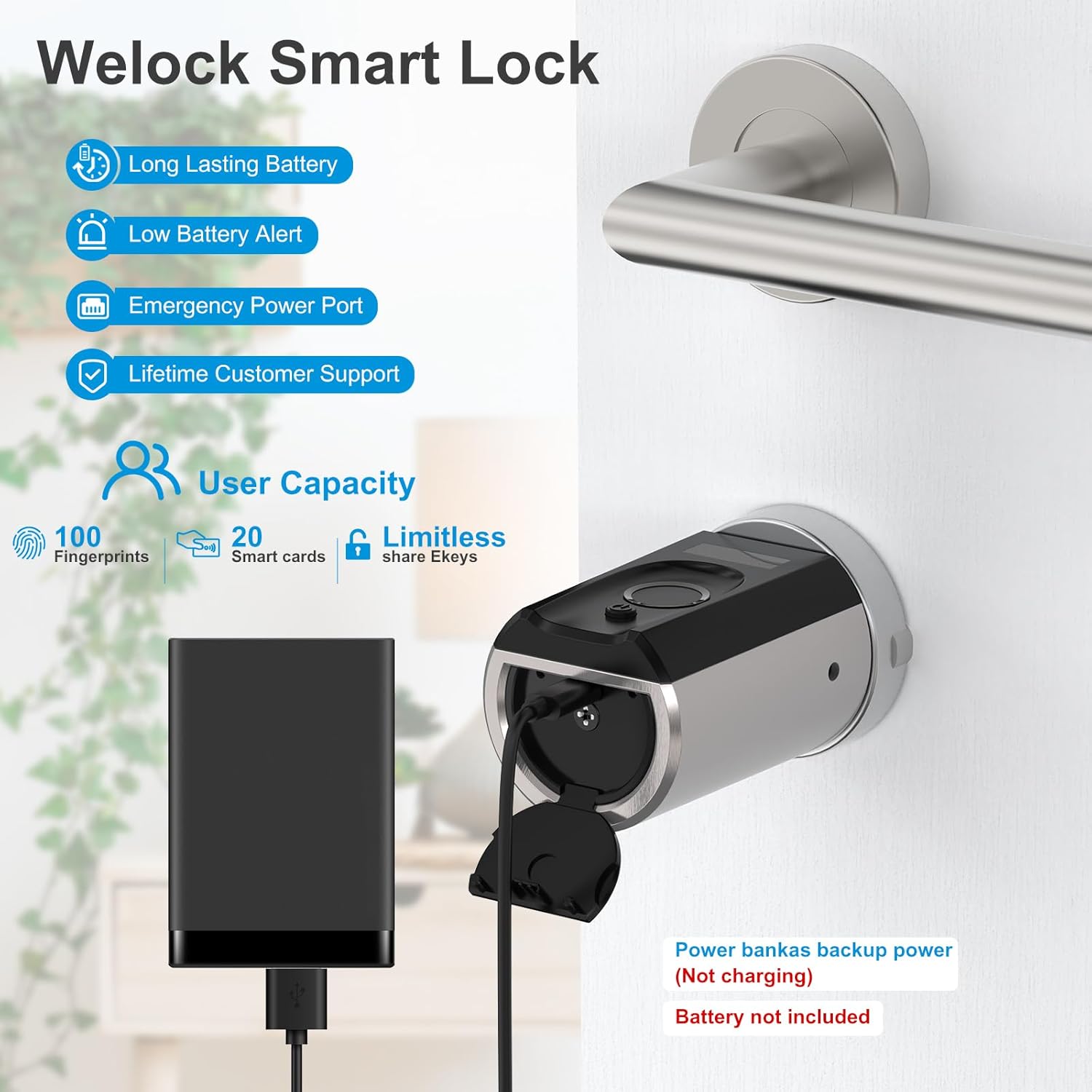 - Four unlocking options: fingerprint, RFID card, WELOCK app (Bluetooth or Wi-Fi connection via compatible setup), and USB backup power unlock.