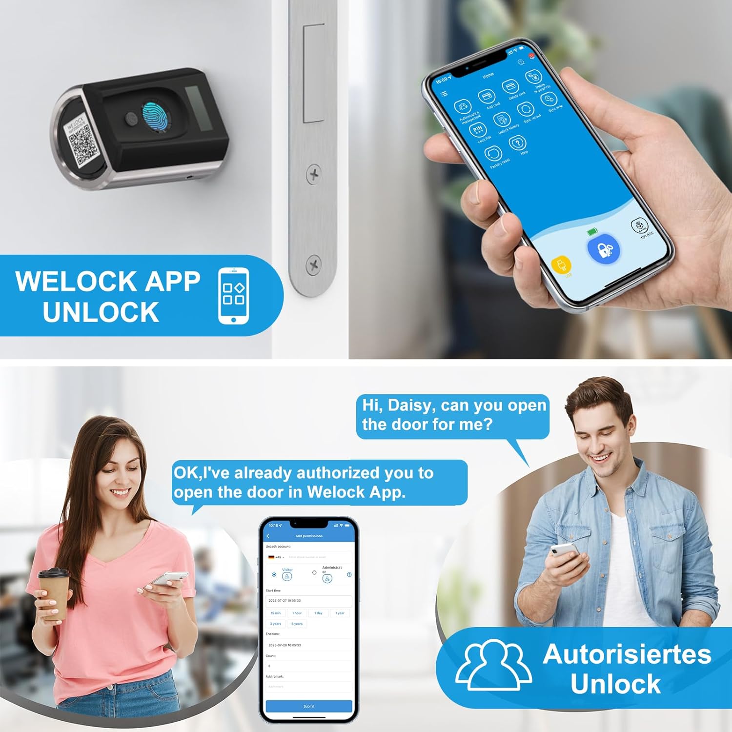 - WELOCK app is available for iOS and Android for user management and unlocking records.