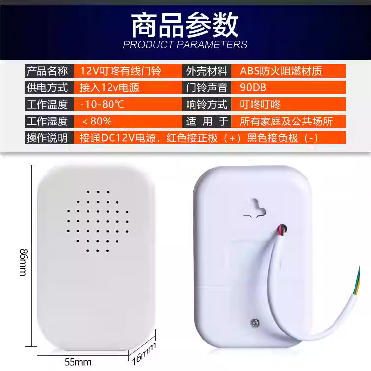 Specifications for 12V Wired Electronic Dingdong Music Doorbell